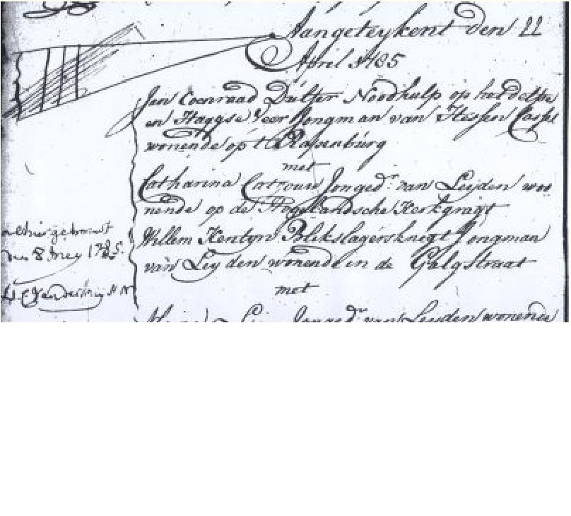 BEROEP: Besteller De huwelijksaankondiging op vrijdag 22 april 1785 in de Pieterskerk vermeldt als beroep : Noodhulp bij Delftse en Haagse Veer